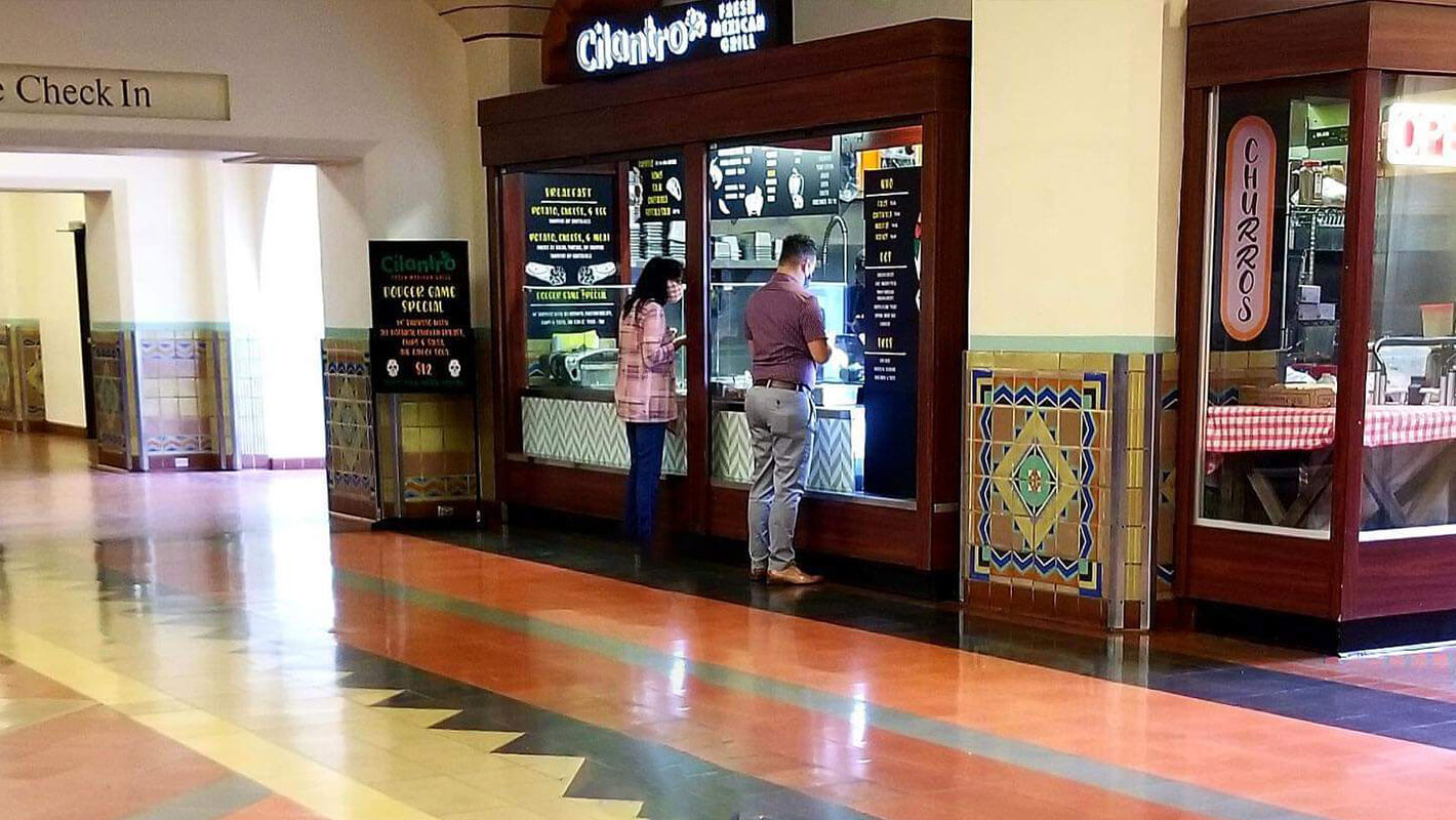 The station features a full-service restaurant and bar, a Mexican grill, a fresh juice and smoothie spot and several fast-food options for eating on-the-go.